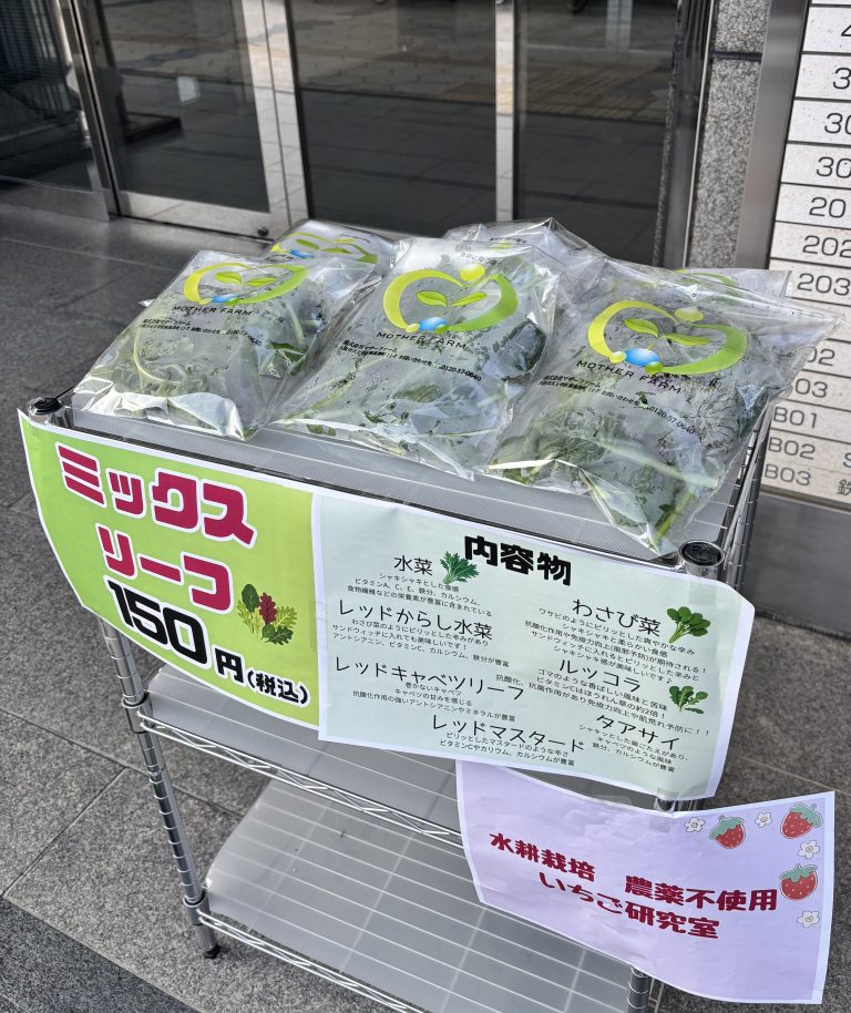 水菜、ルッコラ、わさび菜、レッドからし水菜、レッドキャベツリーフ、ターサイ、レッドマスタードをミックスにして販売しました